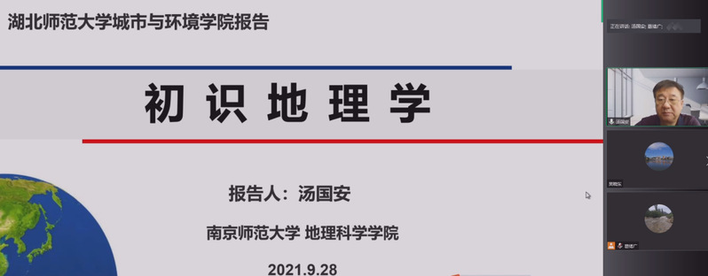 为进一步强化2021级新生专业认知、培养专业认同感,9月28日,全国模范教师、国家级教学名师、南京师范大学汤国安教授应邀通过腾讯会议形式为城环学院新生作了题为《初识地理学》的学术报告。城环学院党委书记杨应华、副院长葛绪广、地理科学系主任吴晓东及教师代表、2021级地理科学全体新生共200余人在现场聆听了报告。院长王湖坤、院党委副书记陈卓及地理专业教师、研究生等在线收听了报告,报告会现场由葛绪广主持。