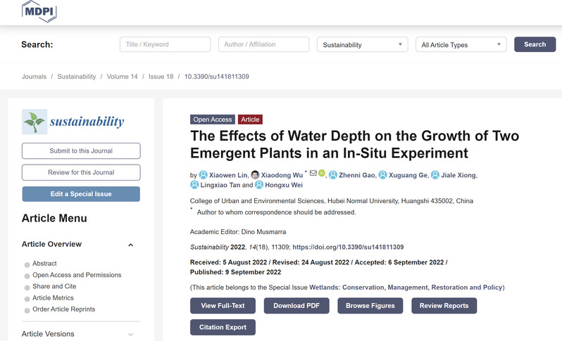 近日,城环学院2021级自然地理学硕士研究生林晓雯以第一作者身份撰写的论文 “The Effects of Water Depth on the Growth of Two Emergent Plants in an In-Situ Experiment”在SCI期刊Sustainability(IF:3.889,Q2)发表。该文通讯作者为吴晓东博士,伟德国际victor1946为唯一单位。共同作者包括葛绪广副教授,2021级自然地理学硕士研究生高珍妮,2020级地理科学专业本科生熊佳乐、谭灵骁和魏宏旭。这是城环学院硕士研究生首次在SCI期刊发表论文。