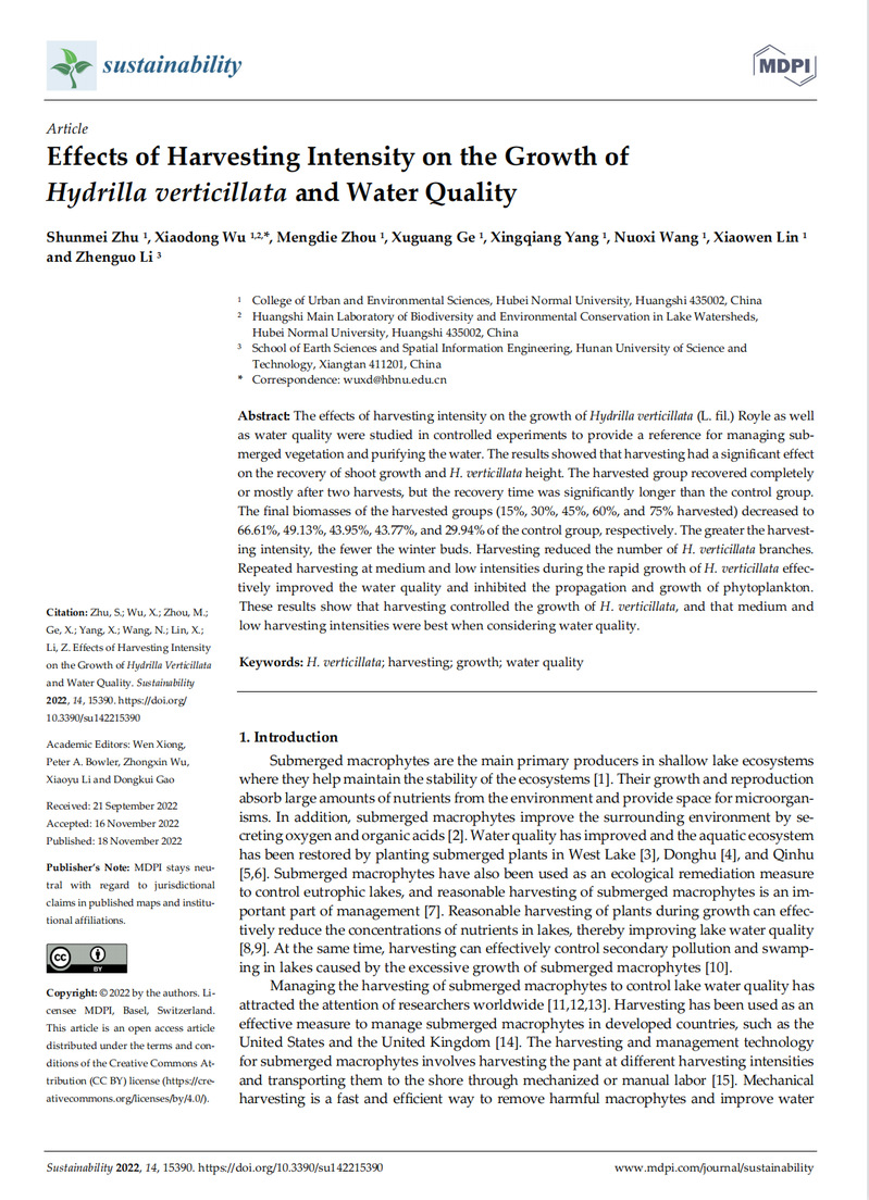近日,城环学院吴晓东博士团队完成的论文“Effects of Harvesting Intensity on the Growth of Hydrilla verticillata and Water Quality”在SCI期刊Sustainability发表。Sustainability是中科院三区期刊(2021年12月最新基础版),2021-2022年影响因子为3.889,主要报道环境、文化、经济和人类活动可持续发展等方面的研究进展。