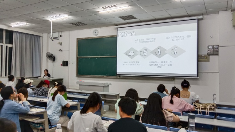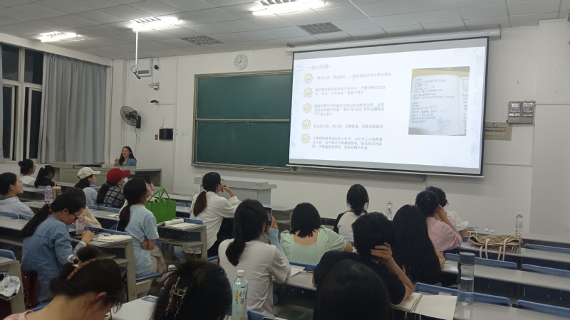 前来学习的同学都陆续落座后,主持人宣布活动正式开始,各位考研成绩优异的学长学姐依次发言,与大家分享他们在考研过程中总结整理的学习资料和宝贵经验,首先是王语秋学姐着重分享了信息差这一方面的重要性,同学们知道了自己在考研信息方面要多收集整理,用真实经历帮助同学们去寻找自身的目标和方向,告诉了同学们选择大于努力这一技巧。杜美瑾学姐则是分享了自己寻找合适的院校的经历,根据自己所读院校的实际情况和报考院校的具体地理位置和考试录取情况两个方面着重分析。张一冉学姐侧重于讲解每一门专业课和公共课的学习方法和分值组成,让同学们对课程学习有一个更深的了解,并且留下了自己的联系方式,让更多同学可以咨询考研问题。杨丽萍学姐着重介绍了每个科目考研资料的如何选择,为同学们推荐了好的考研参考书,以及优秀课程讲解。方浴学姐对自己的考研经历进行详细的总结和分享,她认为备考阶段划分:基础——提升——冲刺三个阶段,并且着重分享了自己是如何选择适合的学校与专业,以及资料获取途径,并且分享自己在考研中的心态变化,从决定自己要考研,到中途也有坚持不下的情绪,最后毅然决定坚持到底,最后也给同学们带来了一些生活方面的建议,号召同学们不要熬夜学习,保持身体健康,合理安排学习计划。