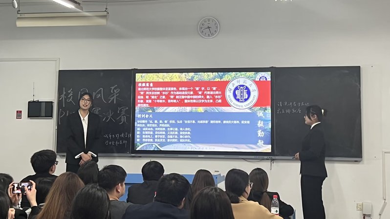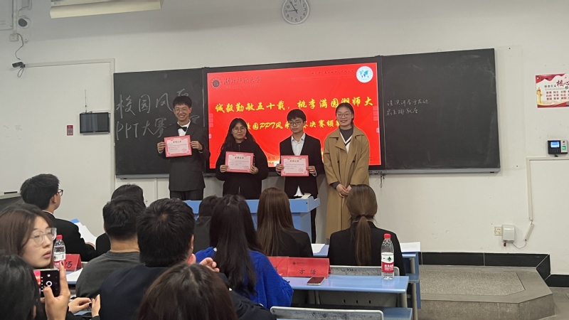 活动正式开始后,各团队根据抽签情况依次上台展示各自团队带来的作品,并派一人作品进行三至五分钟的演讲参与本次比赛的十二组选手大放异彩。有的队伍借精美图片展现湖师风貌,有的队伍将半百校史揉进文字,有的队伍插入视频为同学们展示校园趣味......在场下的其他成员也在不断互相鼓励,为团队加油打气各个团队带来的作品精神内涵丰富,尽显当代青年“厚积薄发”的积淀精神、“美美与共”的和谐精神、“不惧挑战”的拼搏精神和与时俱进的正确价值思想观念PPT内容排版严谨,选手的讲解细致情感到位,将校园的风采展现到了观众面前。在十二组选手的精彩比拼结束后,到了令人紧张的宣布获奖环节,经过评委们的激烈讨论,最终评选出2103班海底小纵队获得一等奖,二等奖获得者为2101班百姓关注的七个小矮人、2101班海底小纵队,三等奖获得者为2103班所以爱会消失对不队、2102班披荆斩棘队、205班雨后春笋队。