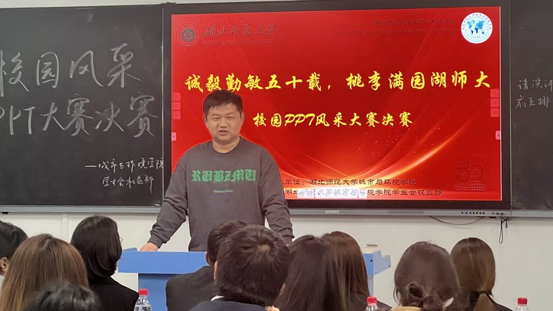 最后由辅导员郭文进行点评,他对此次比赛进行了肯定,总结了选手的表现,对城环学子给予鼓励和希望,同时也祝愿城环学子们能够享受美好的大学生活,勤奋学习,践行“诚毅勤敏”的校训,尽显湖师风采