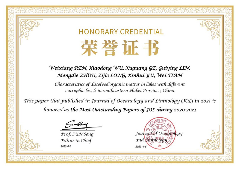 近日,城环学院2016级地理科学专业本科生任伟祥在读期间以第一作者身份发表的SCI论文“Characteristics of dissolved organic matter in lakes with different eutrophic levels in southeastern Hubei Province, China”被评为《Journal of Oceanology and Limnology》期刊2020—2021年度优秀论文,并于5月23日受邀参加期刊高质量发展研讨会和颁奖大会。该论文指导老师为吴晓东副教授。