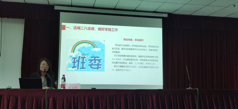 讲座中,陈老师从“活用二八定律,做好常规工作”、“妙用心理活动,增强班级凝聚力”、“善用心理理念,激发学生潜力”、“会用家长力量,保障班级出彩”四方面,结合班级学生典型案例分析,现身说法,强调要多措并举的培养学生的自信心,重视学生积极心理资本的培养与提升,促进班级建设管理的正常运行,建立合作共赢的有效班级管理。