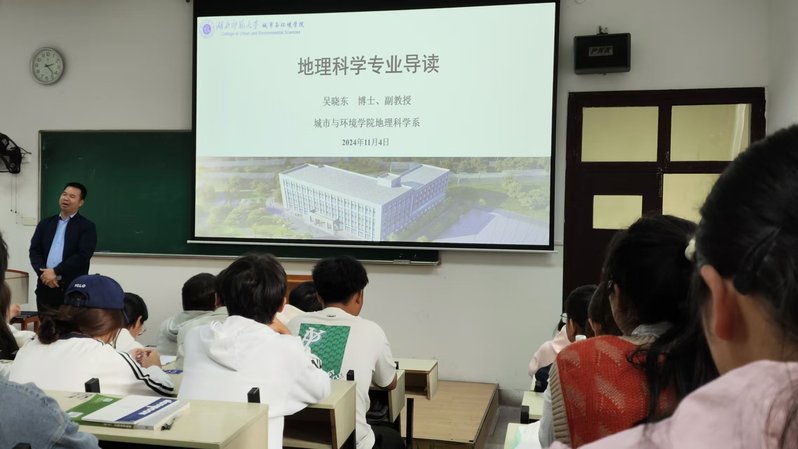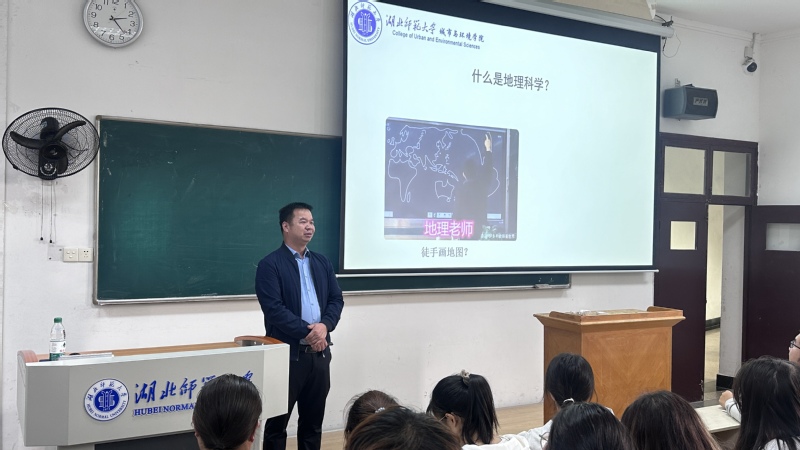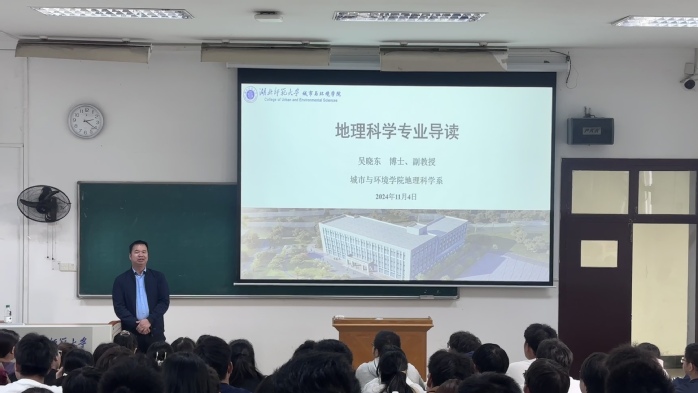 随后,吴教授重点介绍了新时代背景下地理科学所赋予的新使命。随着全球化和信息化的深入发展,地理科学不仅关注地球的自然环境,还涉及人类活动与社会发展的诸多方面,为国家和社会的可持续发展提供了重要支撑。吴教授强调了在新时代背景下,地理科学在环境保护、城市规划、灾害管理、交通规划、公共卫生以及农业生产等多个领域的重要作用,并鼓励同学们积极投身到这一充满挑战和机遇的学科中去。