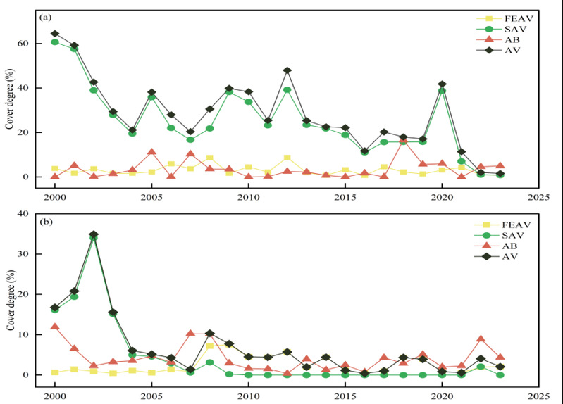 研究表明,保安湖春季水生植物(AV)覆盖度以沉水植物(SAV)为主,整体呈下降趋势。夏季,AV盖度以浮叶植物(FEAV)为主,夏季SAV种类缺失。保安湖SAV覆盖度与TP、TN呈负相关关系,受到水位和透明度的综合影响。当ZM / ZSD比值超过5.2时,SAV生长受到抑制。SAV的物种丰富度经历了三个阶段:物种丰富的第一阶段,仅有一个物种存在的阶段,以及最后物种消亡的阶段。在高水位和低透明度的影响下,SAV消失。保安湖沉积物主要在鱼类扰动和风浪的影响下发生再悬浮,从而加剧水体富营养化,影响水生植物生长。