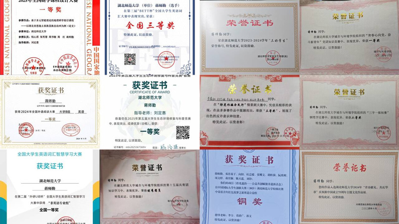蒋师勤,中共预备党员,2023级地理科学(师范类)专业本科生,现任班级班长,曾任学院学生党支部组织部负责人、学院辅导员实习助理等。绩点排名稳居专业前十,综测排名专业第一,连续两年获得校”三好学生”、“优秀共青团员”“优秀学生干部”等荣誉称号,获得综合一、二等奖学金。获得国家级奖项5项,作为团第负责人主持大创、本科生科研立项等4项科研项目,以第一作者身份在省级期刊上发表学术论文并被录用。