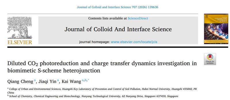12月,Journal of Colloid and Interface Science(《胶体与界面科学》)在线发表该团队研究成果,论文题为“Diluted CO2 photoreduction and charge transfer dynamics investigation in biomimetic S-scheme heterojunction”(《仿生S型异质结中低浓度CO₂光还原与电荷转移动力学研究》)。团队青年教师程强博士为第一作者,王楷教授为论文唯一通讯作者。Journal of Colloid and Interface Science是Elsevier出版社旗下的化学领域期刊,SCI中科院大类一区TOP期刊,最新影响因子为9.7。