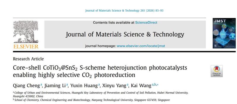 10月,Journal of Materials Science & Technology(《材料科学与技术杂志》)在线发表该团队研究成果,论文题为“Core–shell CoTiO3@SnS2 S-scheme heterojunction photocatalysts enabling highly selective CO2 photoreduction”(《核壳结构CoTiO₃@SnS₂ S型异质结光催化剂实现高选择性CO₂光还原》)。团队青年教师程强博士为第一作者,王楷教授为论文唯一通讯作者。Journal of Materials Science & Technology是Elsevier出版社旗下的材料科学领域期刊,SCI中科院大类一区TOP期刊,最新影响因子为14.3。