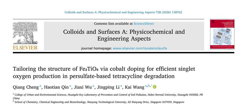 10月,Colloids and Surfaces A: Physicochemical and Engineering Aspects(《胶体和表面A-物理化学和工程》)在线发表该团队研究成果,论文题为“Tailoring the structure of Fe₂TiO₅ via cobalt doping for efficient singlet oxygen production in persulfate-based tetracycline degradation”(《钴掺杂调控Fe₂TiO₅结构促进过硫酸盐活化高效生成单线态氧及四环素降解》)。团队青年教师程强博士为第一作者,王楷教授为论文唯一通讯作者。Colloids and Surfaces A: Physicochemical and Engineering Aspects是Elsevier出版社旗下的物理化学领域期刊,SCI中科院大类二区期刊,最新影响因子为5.4。