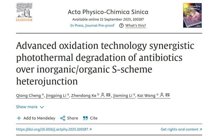 9月,Acta Physico-Chimica Sinica(《物理化学学报》)在线发表该团队研究成果,论文题为“Advanced oxidation technology synergistic photothermal degradation of antibiotics over inorganic/organic S-scheme heterojunction”(《无机/有机S型异质结构建及高级氧化技术协同光热降解抗生素研究》)。团队青年教师程强博士为第一作者,王楷教授为论文共同通讯作者。Acta Physico-Chimica Sinica是Elsevier出版社旗下的化学领域期刊,SCI中科院大类二区期刊,最新影响因子为13.5。