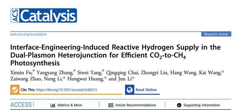 12月,ACS Catalysis(《美国化学会—催化》)在线发表该团队合作研究成果,论文题为“Interface-Engineering-Induced Reactive Hydrogen Supply in Dual-Plasmon Heterojunction for Efficient CO2-to-CH4 Photosynthesis”(《界面工程诱导双等离激元异质结中活性氢供给以实现高效CO2光催化制CH4》)。团队负责人王楷教授为第一通讯作者,武汉理工大学李能教授、中国地质大学(北京)黄洪伟教授、郑州大学李俊教授为共同通讯作者。ACS Catalysis是美国化学会旗下期刊,SCI中科院大类一区TOP期刊,最新影响因子为13.1。