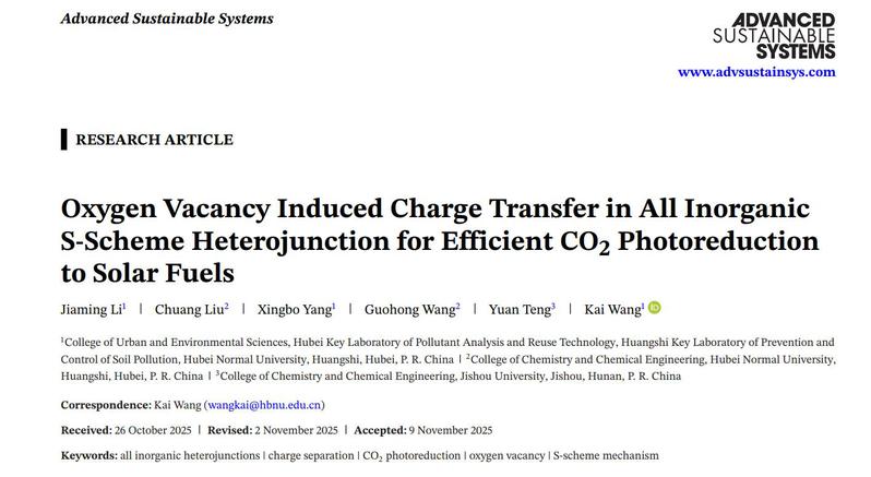 11月,Advanced Sustainable Systems(《先进可持续系统》)在线发表该团队研究成果,论文题为“Oxygen Vacancy Induced Charge Transfer in All Inorganic S-Scheme Heterojunction for Efficient CO2 Photoreduction to Solar Fuels”(《氧空位诱导的全无机S型异质结电荷转移实现高效CO₂光还原制备太阳燃料》)。团队青年教师李嘉明博士为第一作者,王楷教授为论文唯一通讯作者。Advanced Sustainable Systems是Wiley出版社旗下的材料科学领域期刊,SCI中科院大类三区期刊,最新影响因子为6.1。